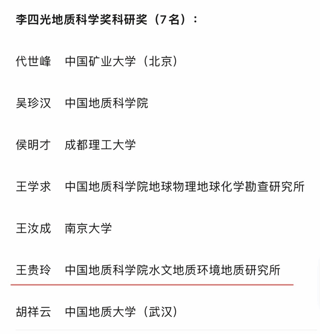 11月8日,李四光地质科学奖基金会发布《关于颁发第十九次李四光地质科学奖的决定》,公布了第十九次李四光地质科学奖获奖者名单,我院银龄专家王贵玲研究员荣获李四光地质科学奖科研奖。