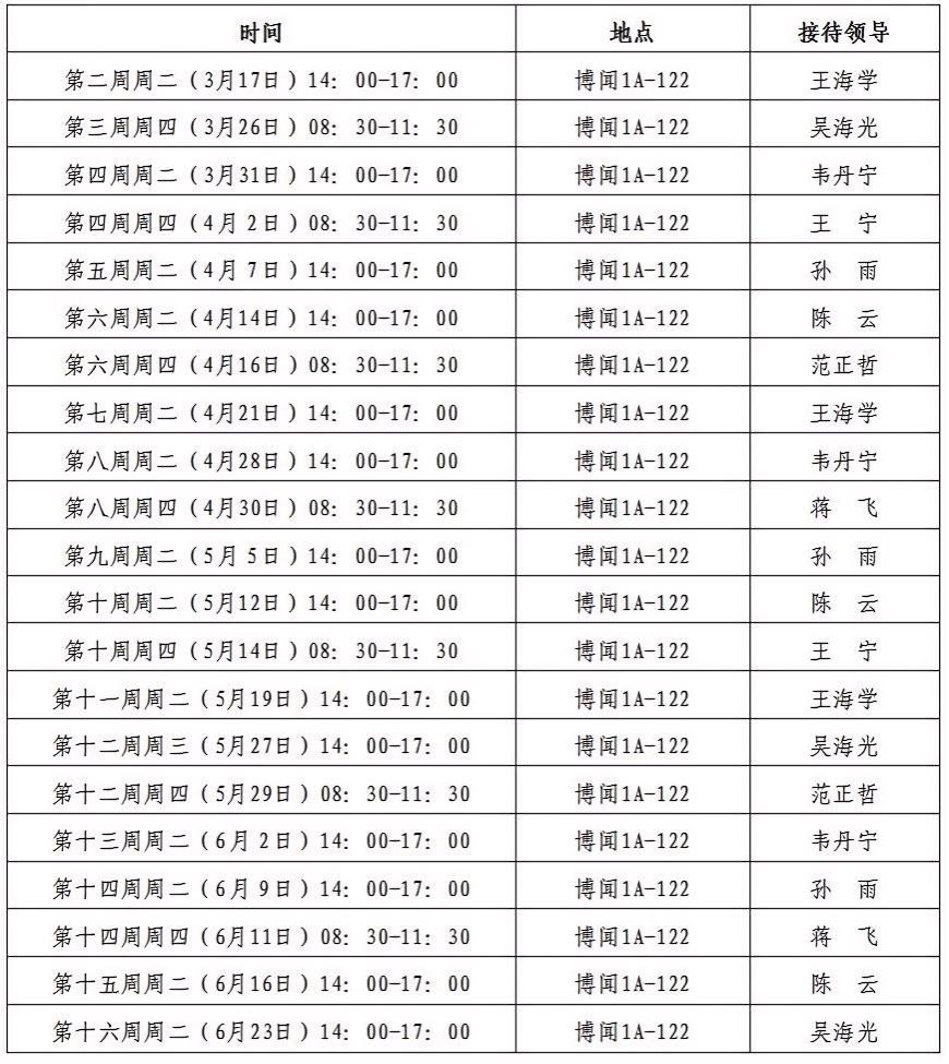 为了更好践行“以师生为中心”的理念,精准把握师生需求,切实解决教学科研及生活中的实际问题,特制定地球科学学院院领导接待日安排计划。详见附表1。